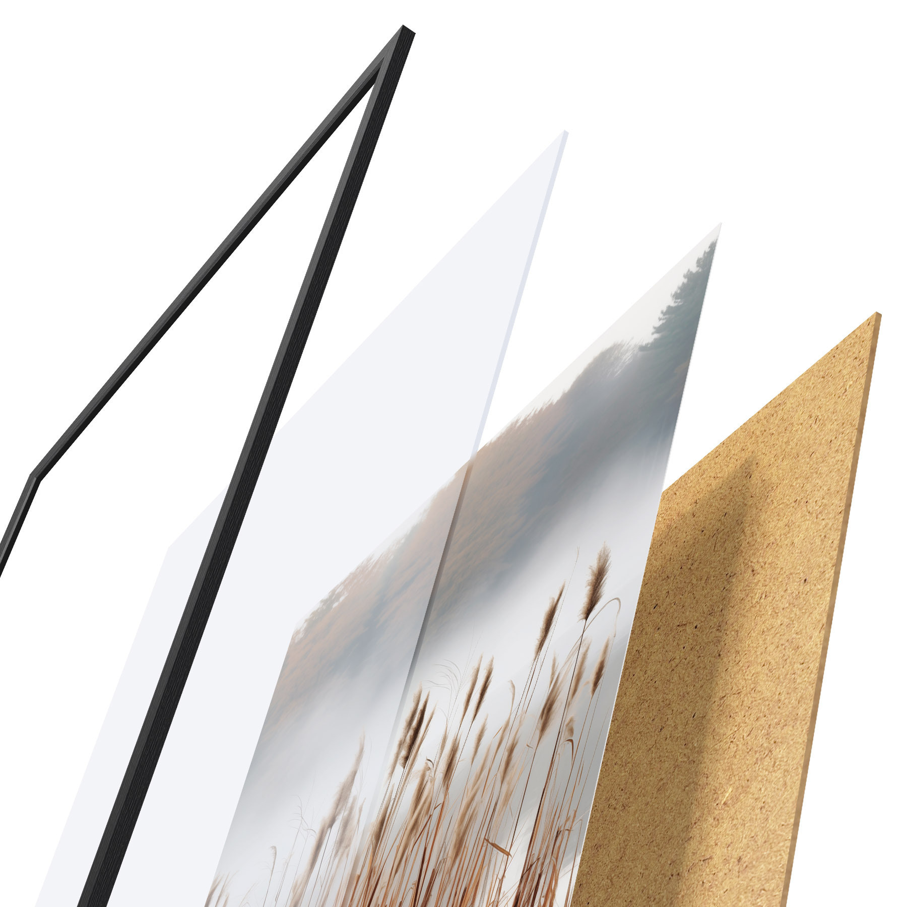 Постер на стіну Високі очерети, що ростуть у водоймі, вода відбиває очерети, туманний фон, м'яке світло, природний пейзаж Nr f46696