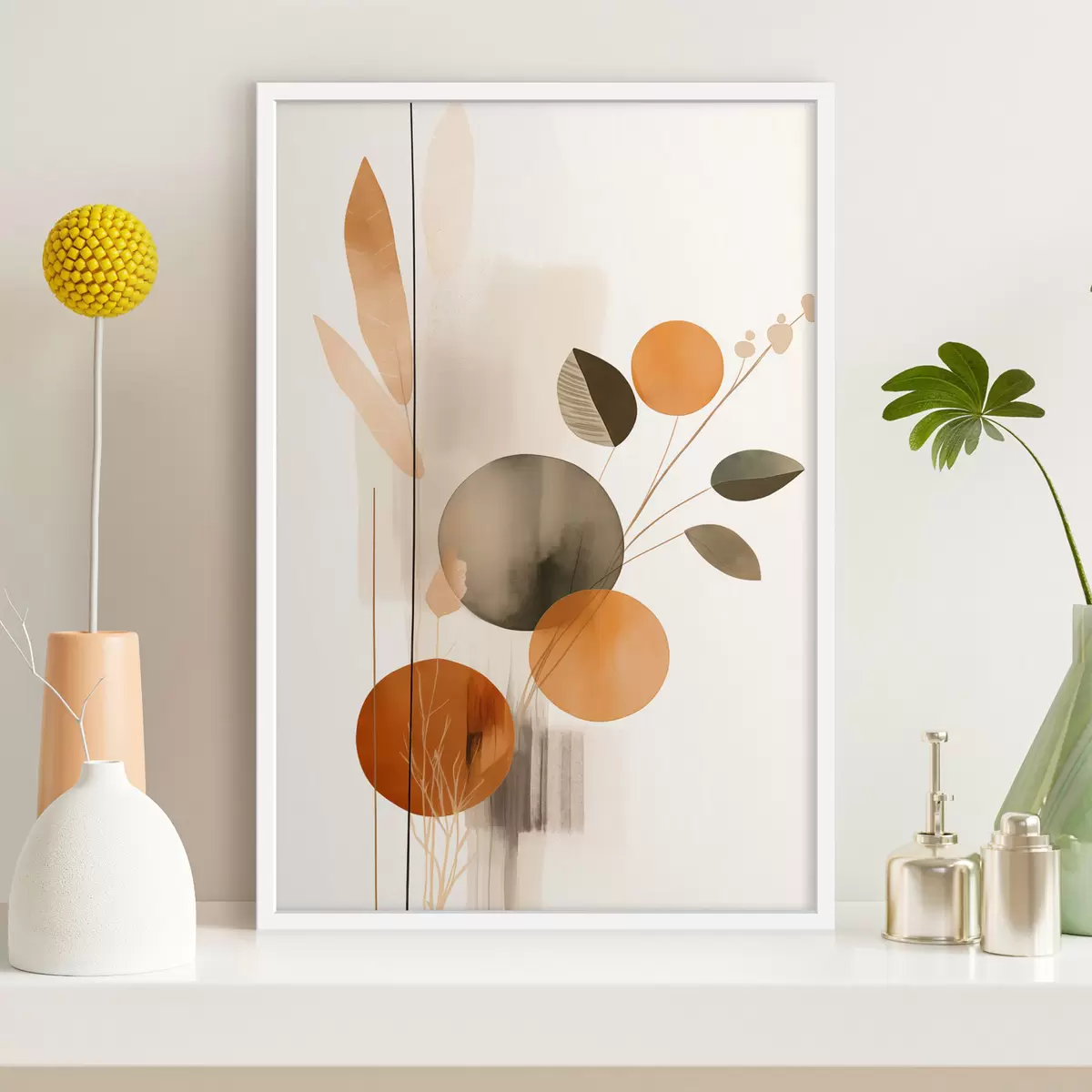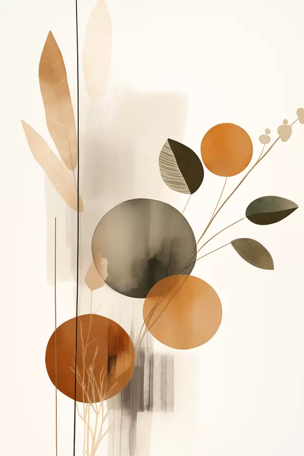 Постер на стіну Абстрактна імітація живопису з помаранчевими та сірими колами, листям і гілками, сучасний стиль, ефект акварелі Nr f46697