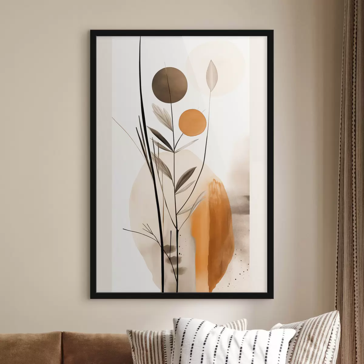Постер на стіну Абстрактна імітація живопису з помаранчевими та сірими колами, листям і гілками, сучасний стиль, ефект акварелі Nr f46698