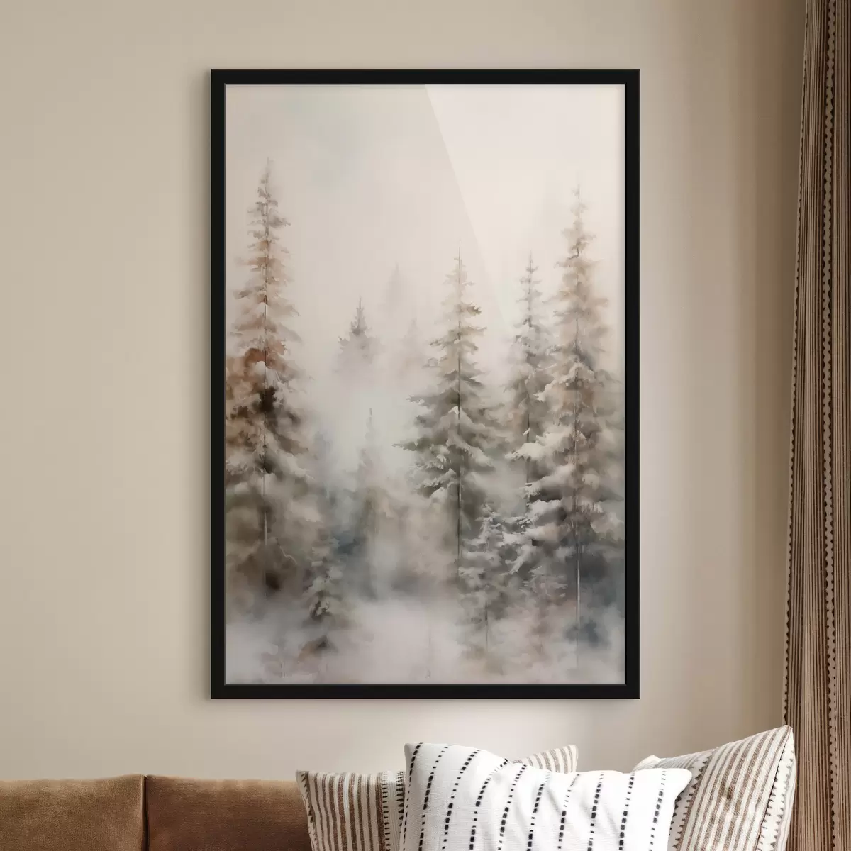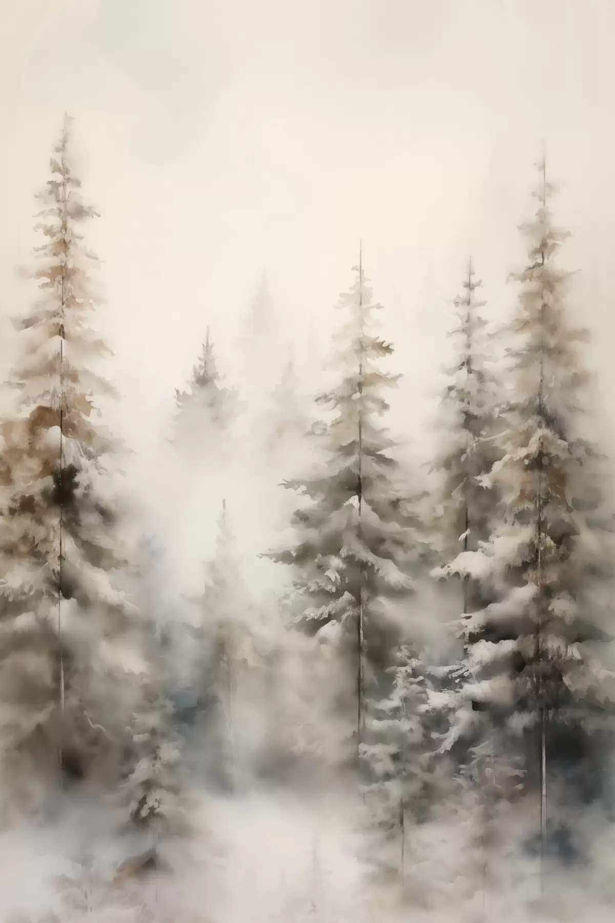 Постер на стіну Високі сосни, вкриті снігом, стоять у туманному лісі, м'яка, приглушена зимова сцена Nr f46701