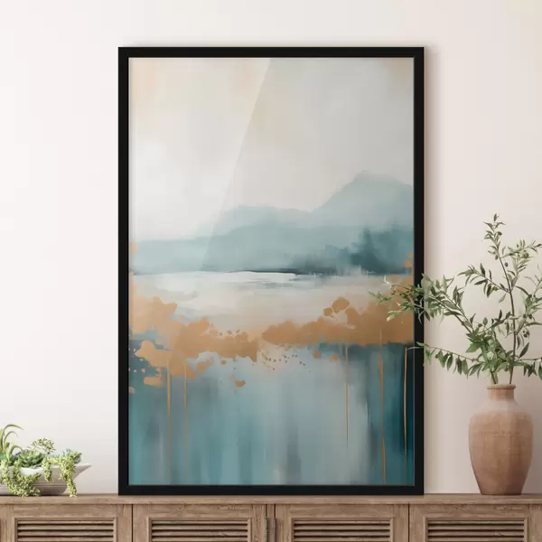 Постер на стіну Абстрактний пейзаж з горами та озером у кольорах бірюзового та текстурованого жовтого, м'які мазки пензлем, мінімалістичне мистецтво Nr f46703