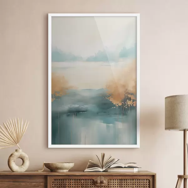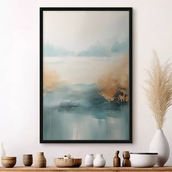 Постер на стіну Абстрактний пейзаж з горами та озером у кольорах бірюзового та текстурованого жовтого, м'які мазки пензлем, мінімалістичне мистецтво Nr f46704