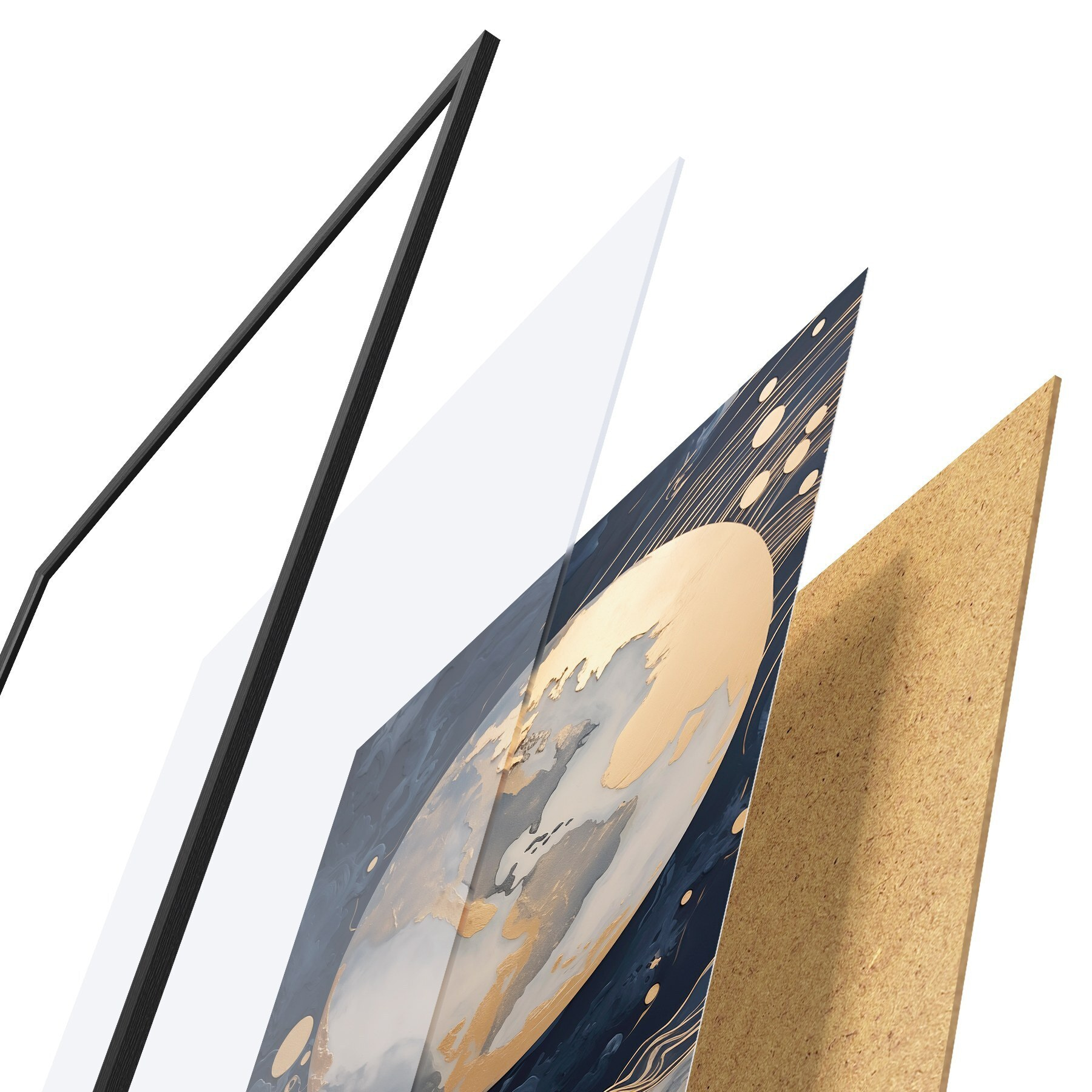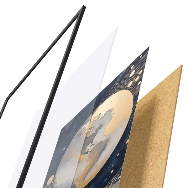 Постер складається з рами, оргскла, надрукованого зображення та підкладки з ДСП. Завдяки кріпленням на звороті плакат можна одразу ж повісити на стіну.