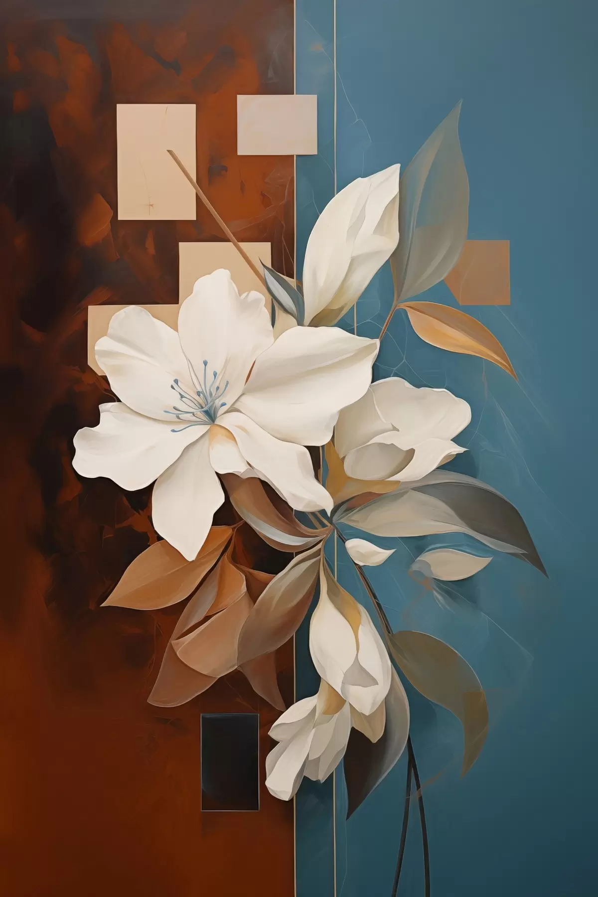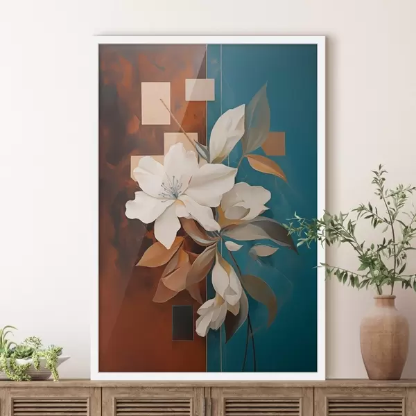 Постер на стіну Абстрактні білі квіти та листя на тлі коричневого та синього кольорів з абстрактними формами, у мінімалістичному стилі Nr f46709
