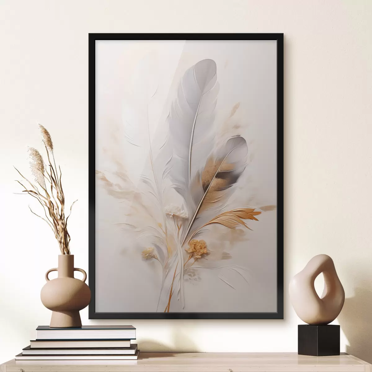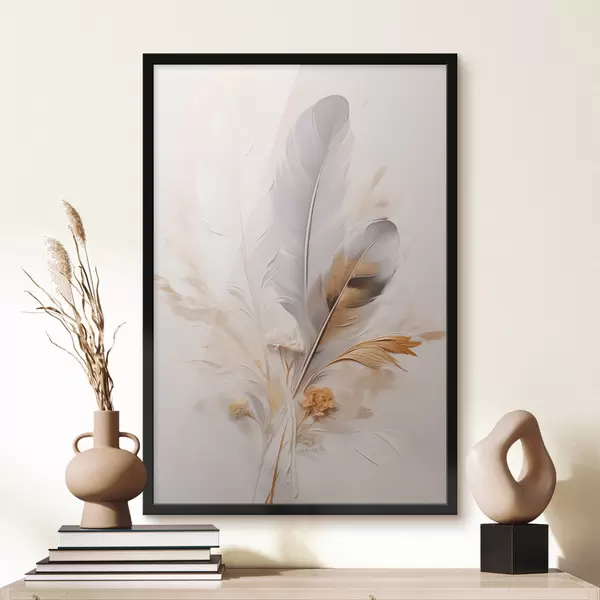 Постер на стіну Абстрактні пір'я, оточені бежевими та коричневими пучками, м'які та ніжні, на світло-бежевому тлі Nr f46712