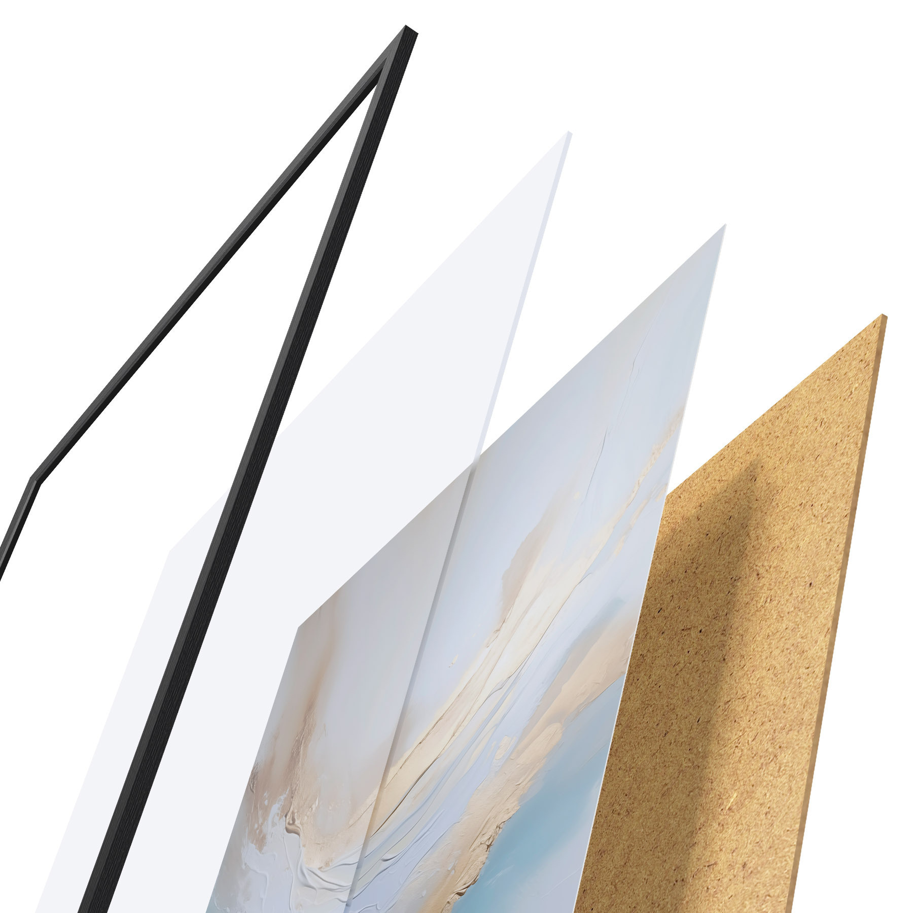 Постер складається з рами, оргскла, надрукованого зображення та підкладки з ДСП. Завдяки кріпленням на звороті плакат можна одразу ж повісити на стіну.