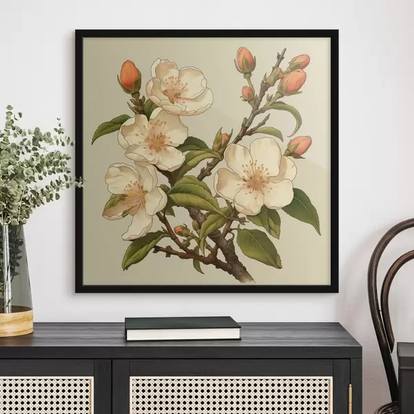 Постер на стіну Квітуча гілка з білими квітами на бежевому тлі в стилі класичної ілюстрації Nr f46923