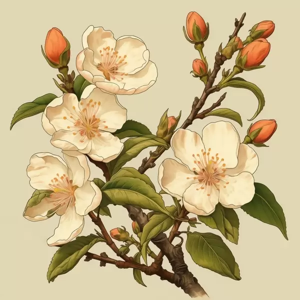 Постер на стіну Квітуча гілка з білими квітами на бежевому тлі в стилі класичної ілюстрації Nr f46923