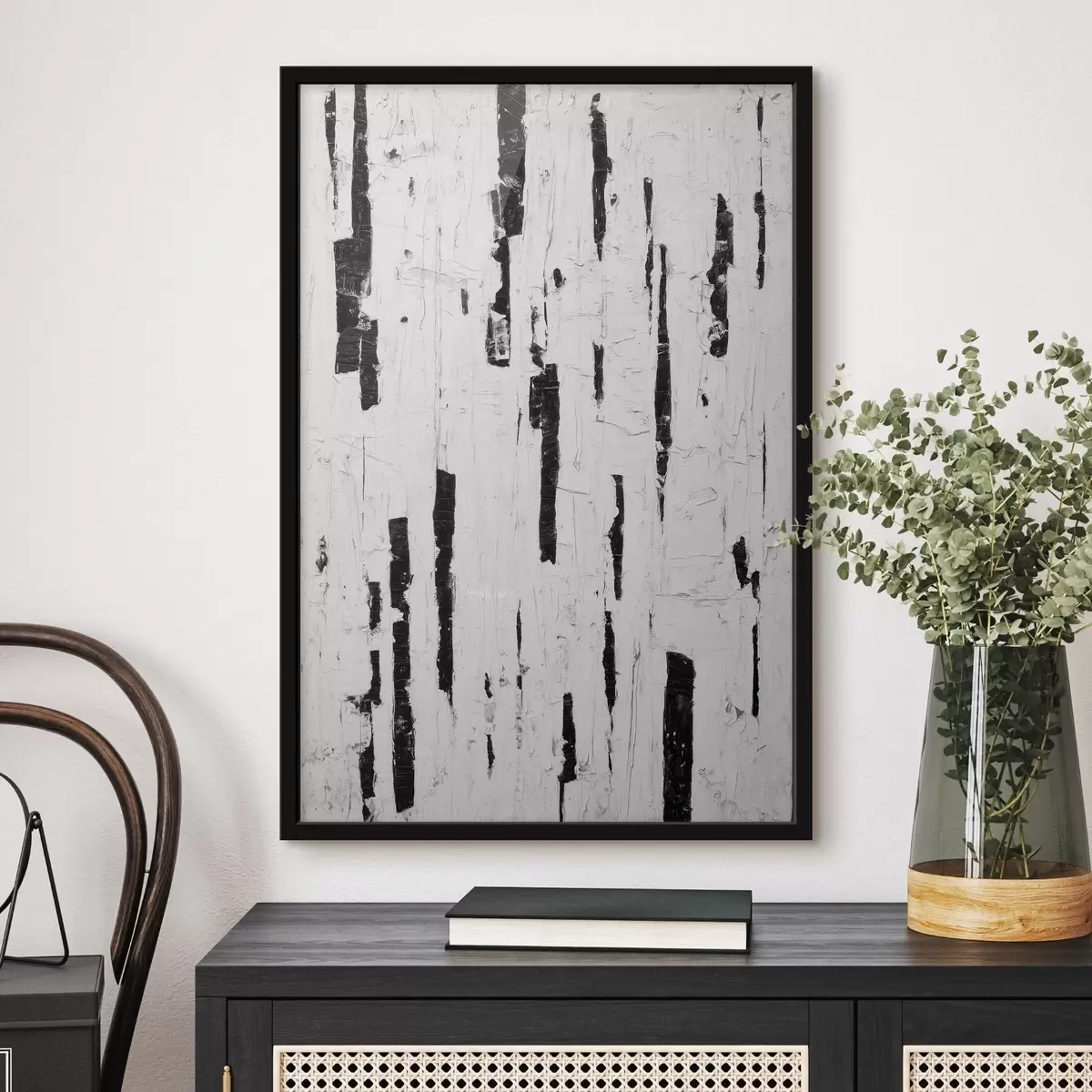 Постер на стіну Абстрактна композиція з чорними вертикальними мазками на білому тлі в стилі олійного живопису Nr f46956