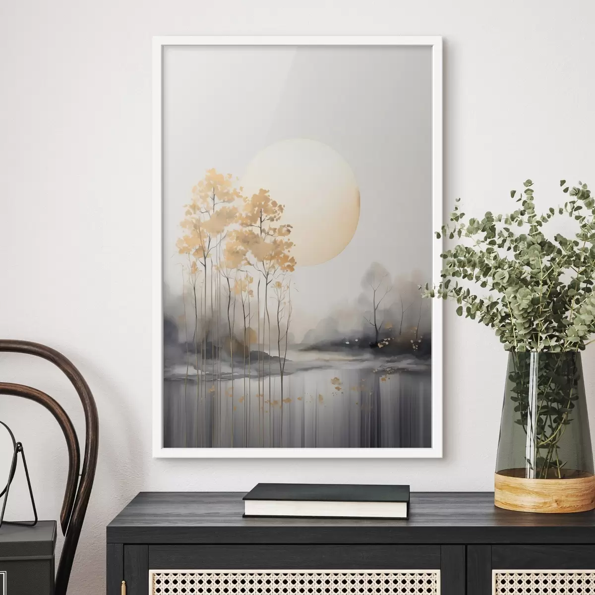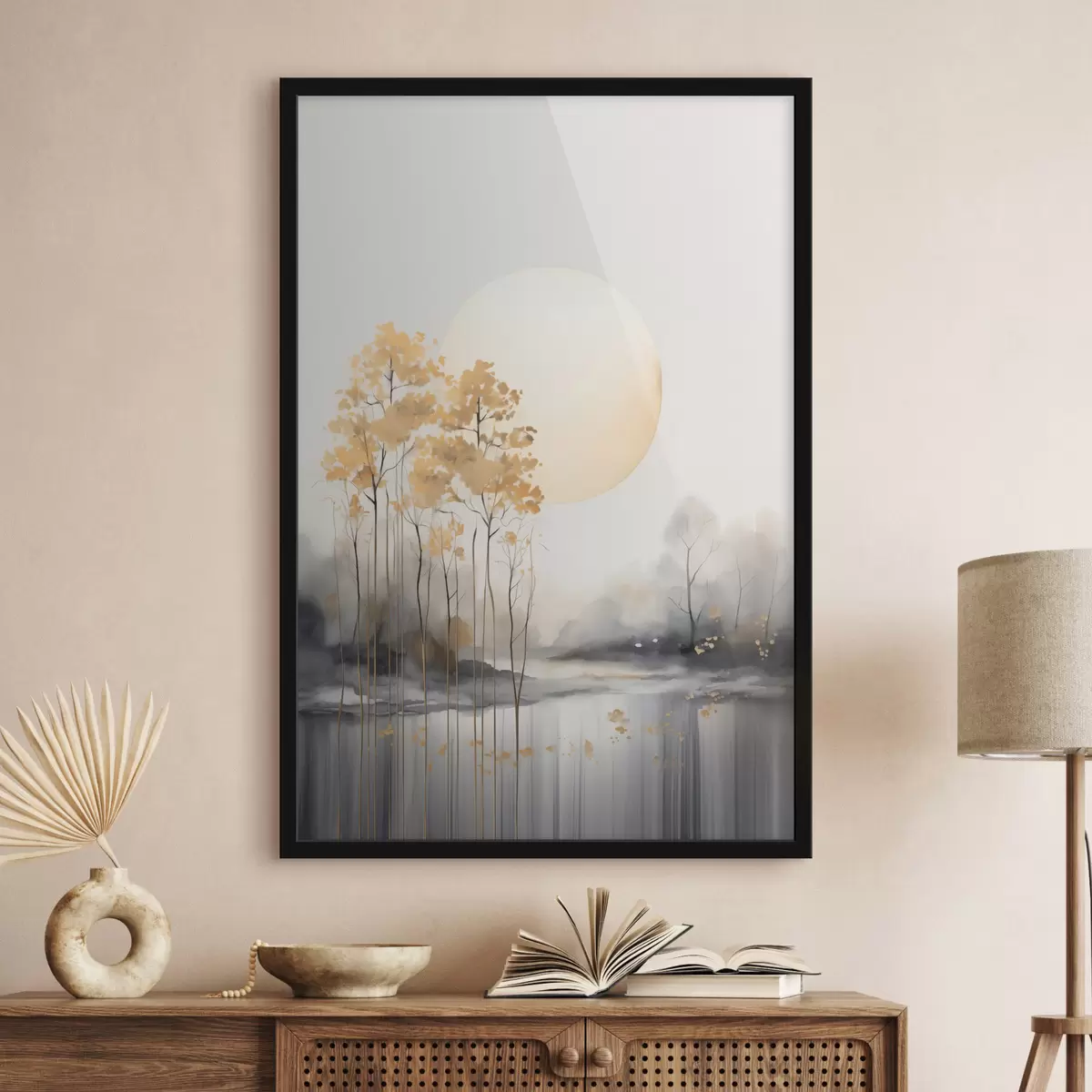 Постер на стіну Декоративний абстрактний пейзаж, високі дерева з жовтим листям, річка і туман на задньому плані Nr f47014