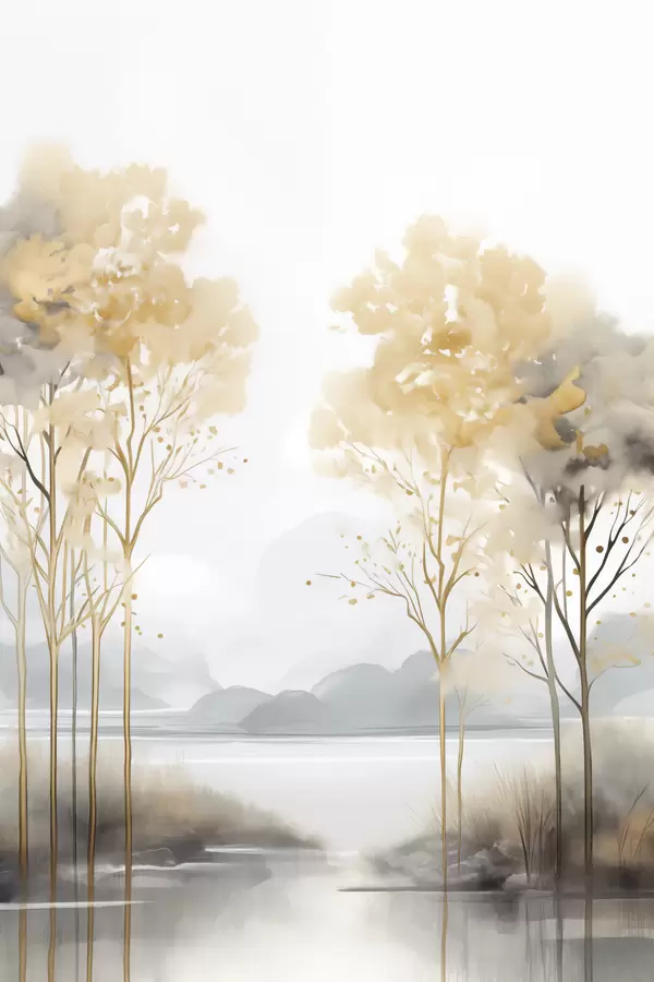 Постер на стіну Декоративний абстрактний пейзаж, високі дерева з жовтим листям, річка і туман на задньому плані Nr f47015