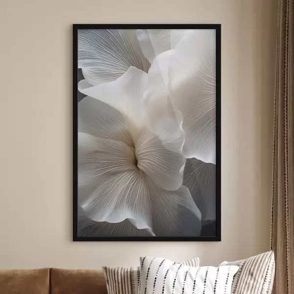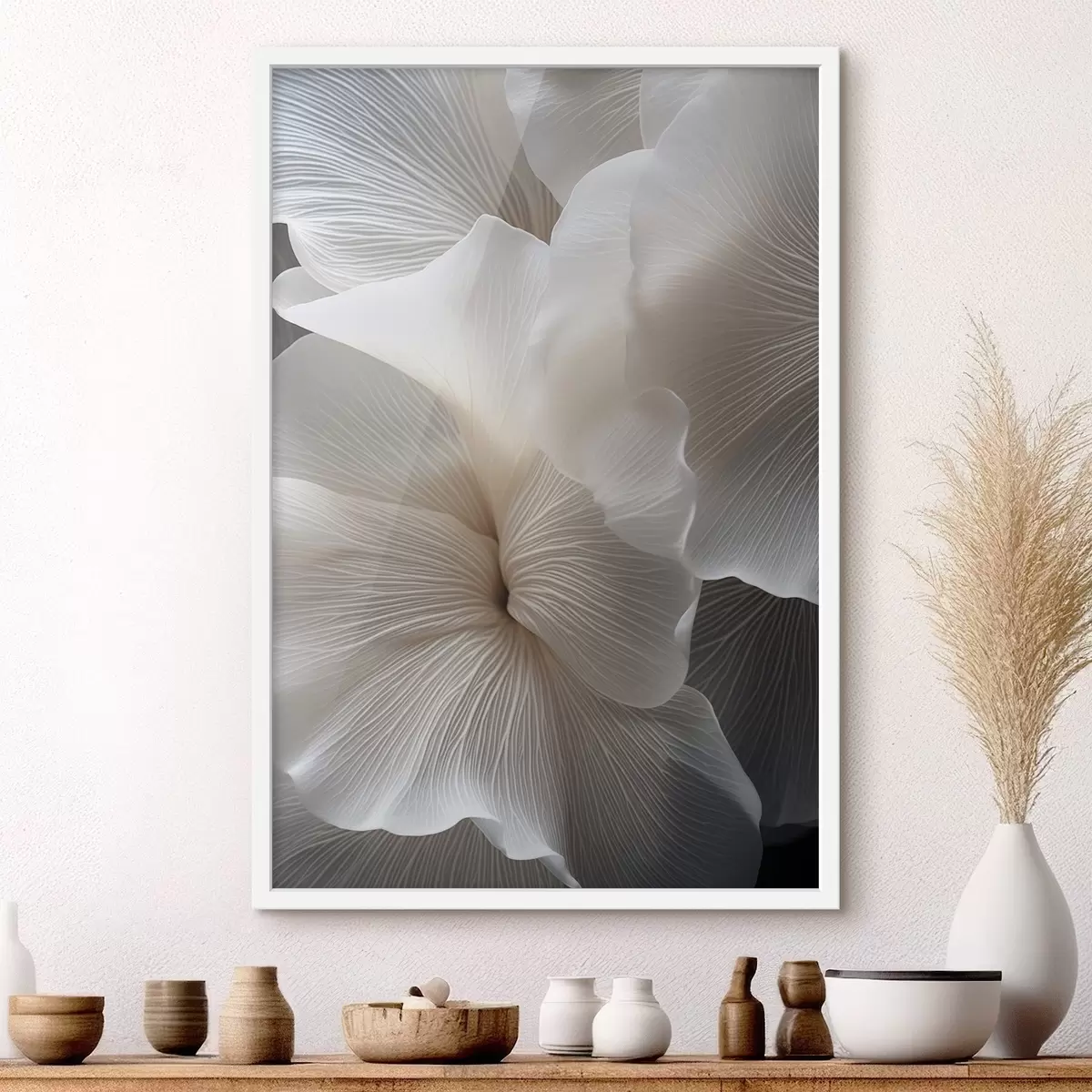 Постер на стіну Крупний план ніжних абстрактних білих квіткових пелюсток зі складними лініями та розмитим темним фоном Nr f47019
