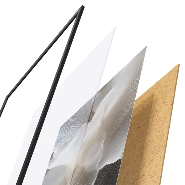 Постер складається з рами, оргскла, надрукованого зображення та підкладки з ДСП. Завдяки кріпленням на звороті плакат можна одразу ж повісити на стіну.
