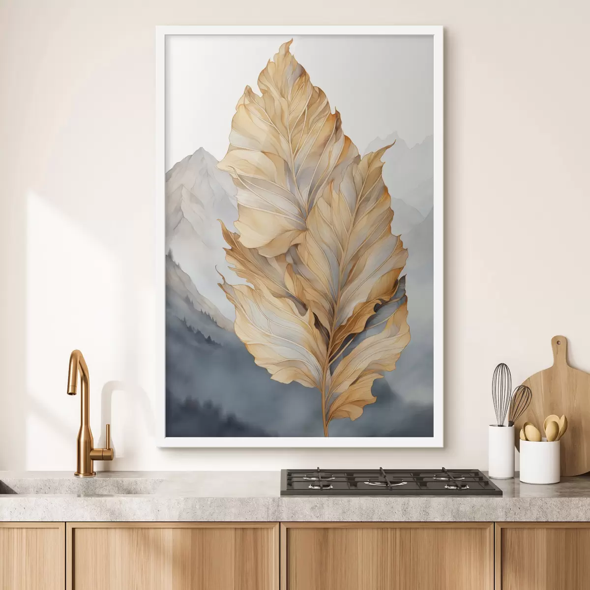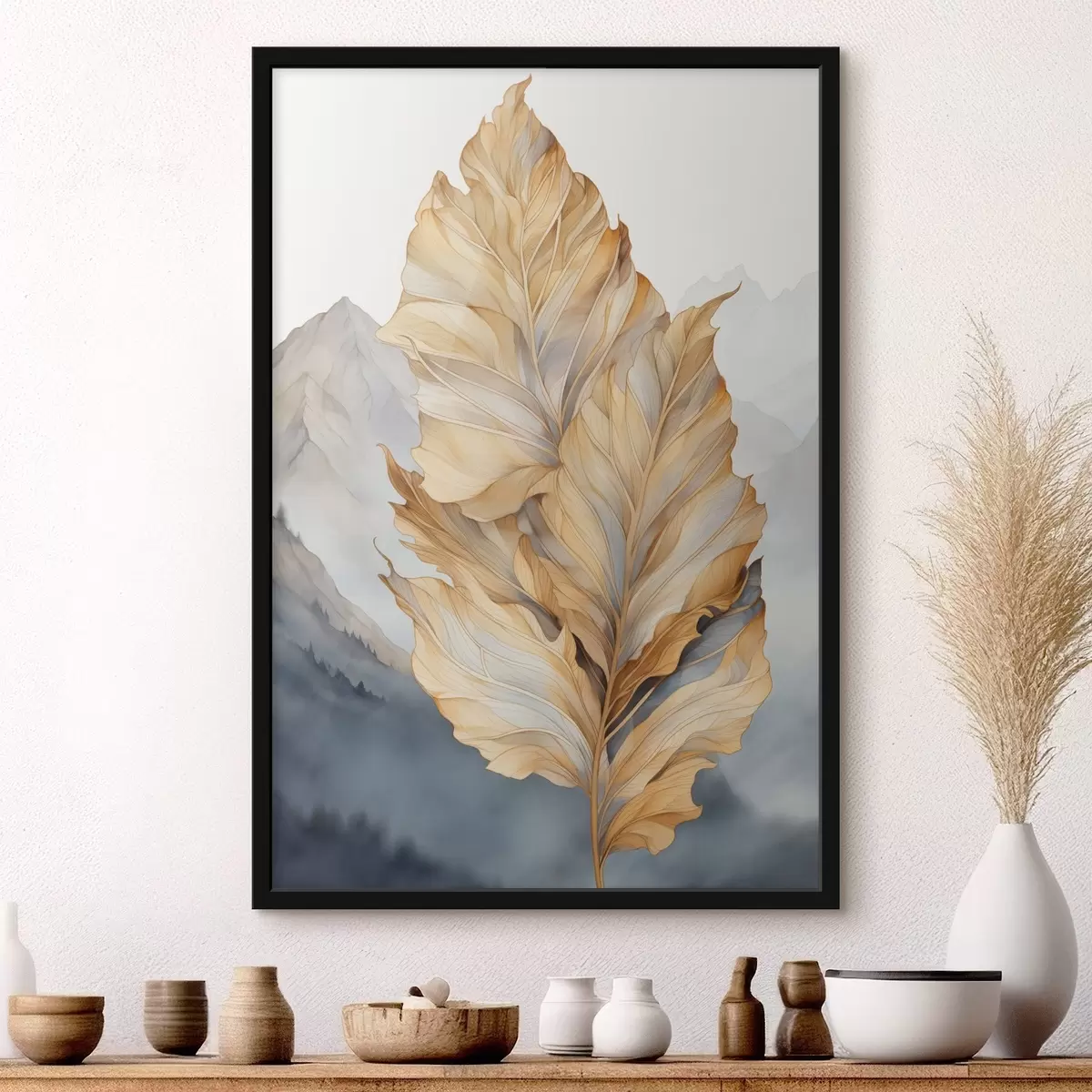 Постер на стіну Абстрактні великі жовті та коричневі листя зі складними деталями на тлі гірського пейзажу Nr f47022
