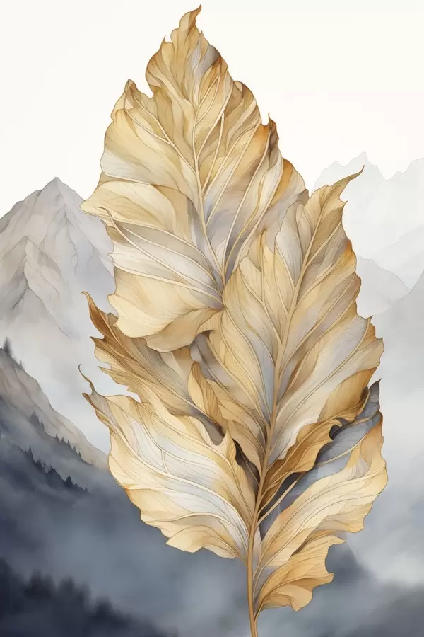 Постер на стіну Абстрактні великі жовті та коричневі листя зі складними деталями на тлі гірського пейзажу Nr f47022