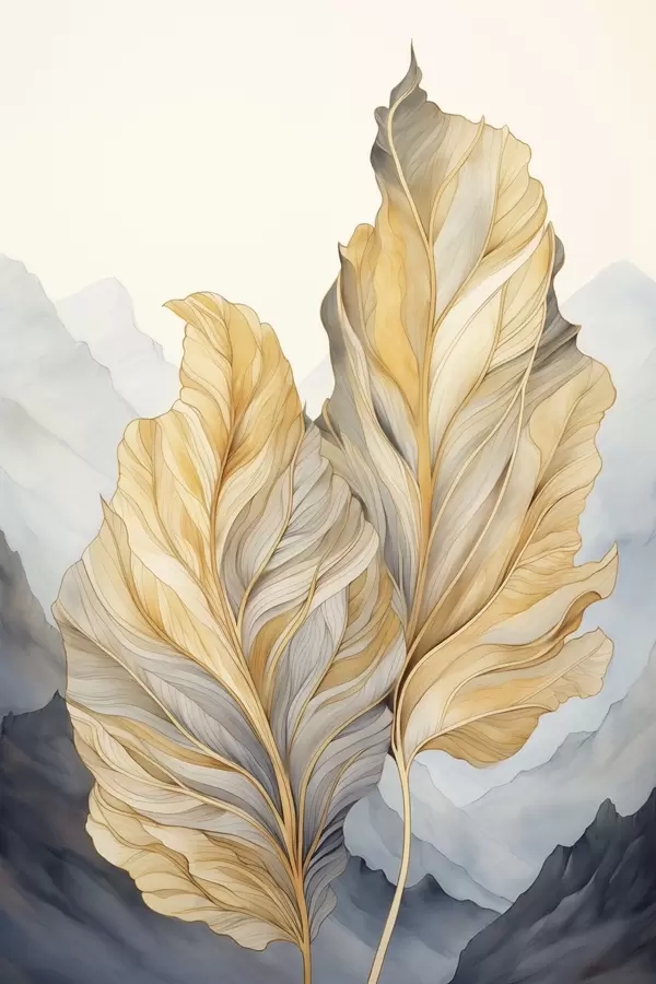 Постер на стіну Абстрактні великі жовті та коричневі листя зі складними деталями на тлі гірського пейзажу Nr f47023