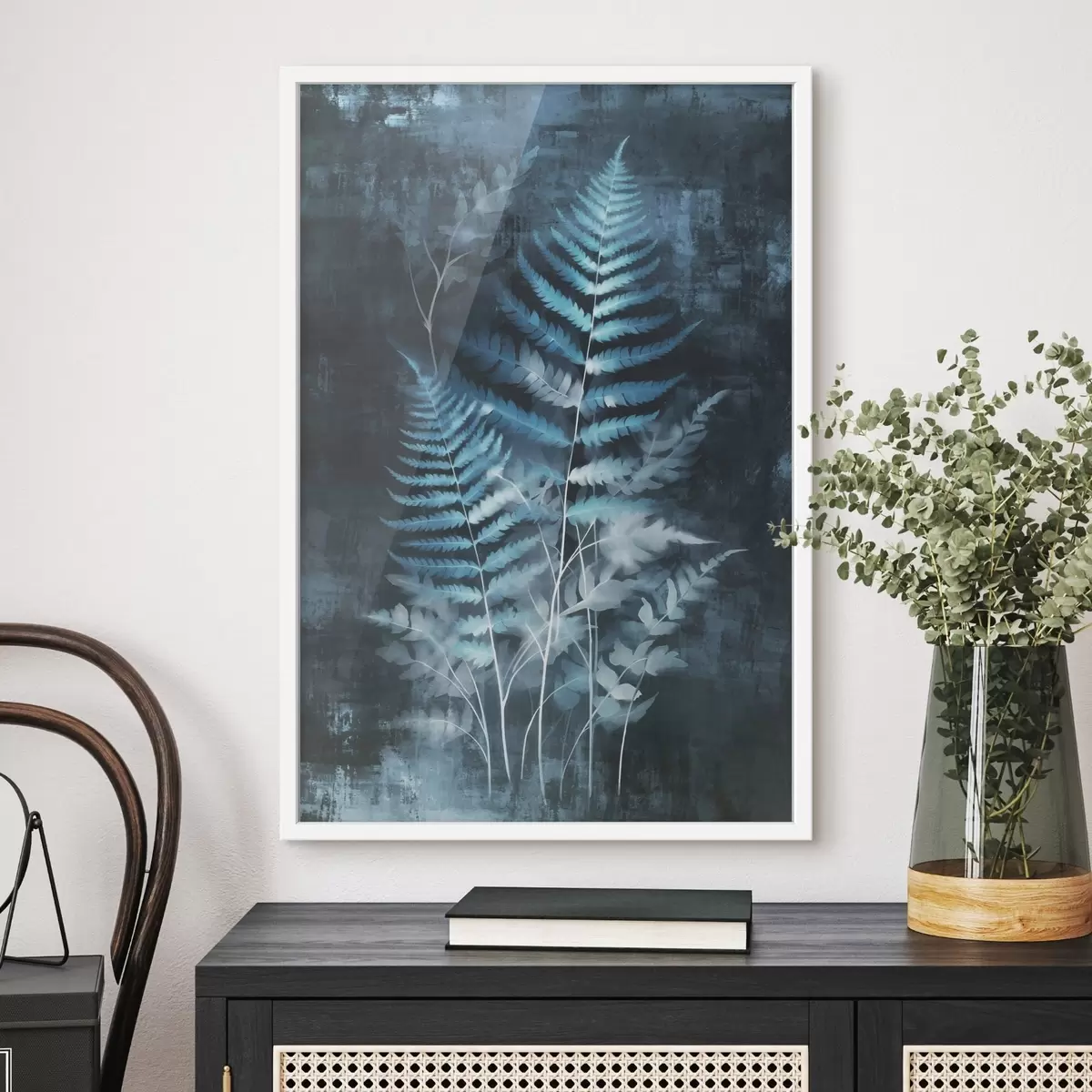 Постер на стіну Блакитні папороті та рослини на темному, фактурному тлі, з акцентом на складних деталях, ефект рентгенівського знімка Nr f47026