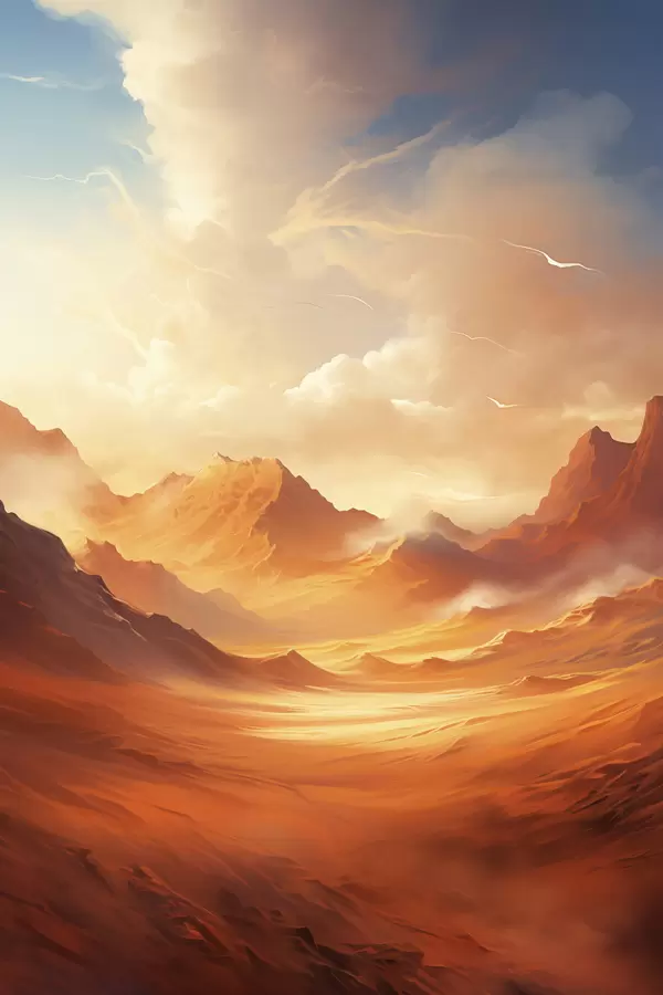 Постер на стіну Величезний помаранчевий пустельний ландшафт з високими скелястими горами під туманним, сонячним небом з рідкими хмарами Nr f47028