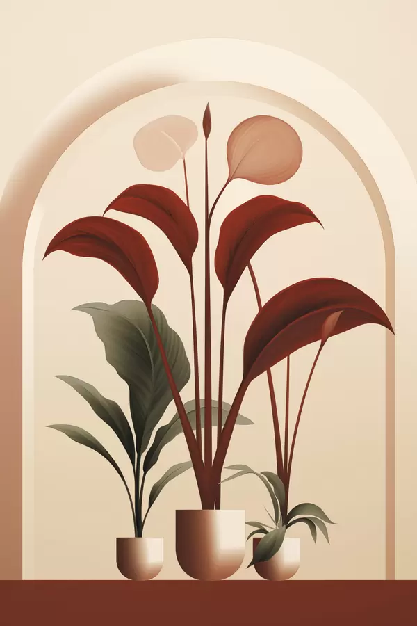Постер на стіну Абстрактні рослини в горщиках з великими зеленими і червоними листям перед кремовою аркою Nr f47033