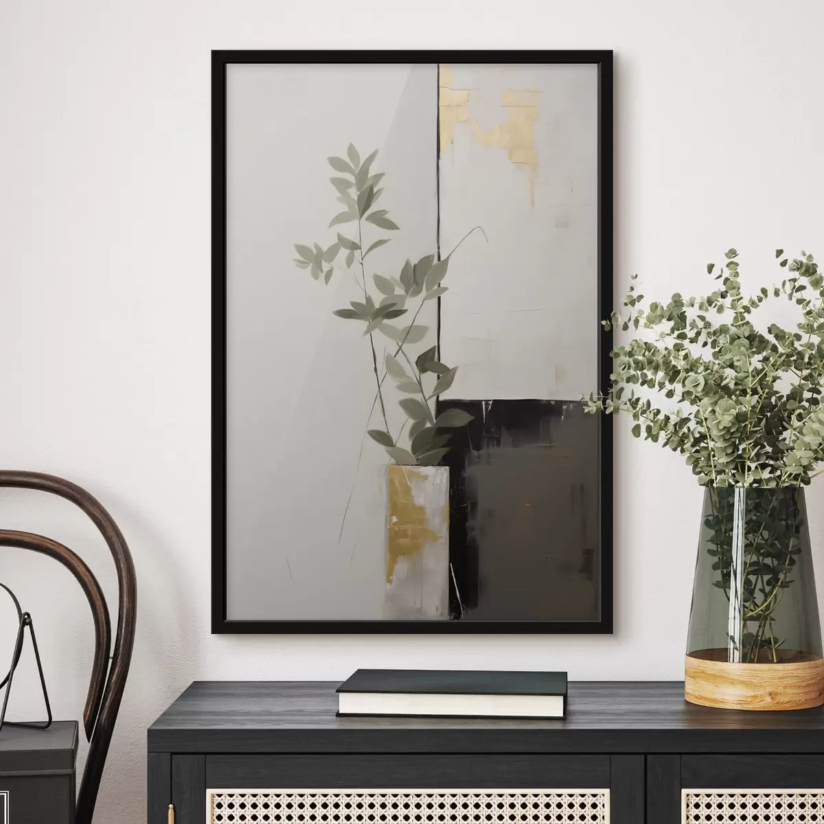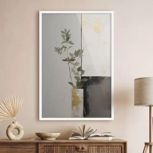 Постер на стіну Мінімалістична фактурна картина вази з зеленим листям на тлі абстрактних геометричних фігур Nr f47036