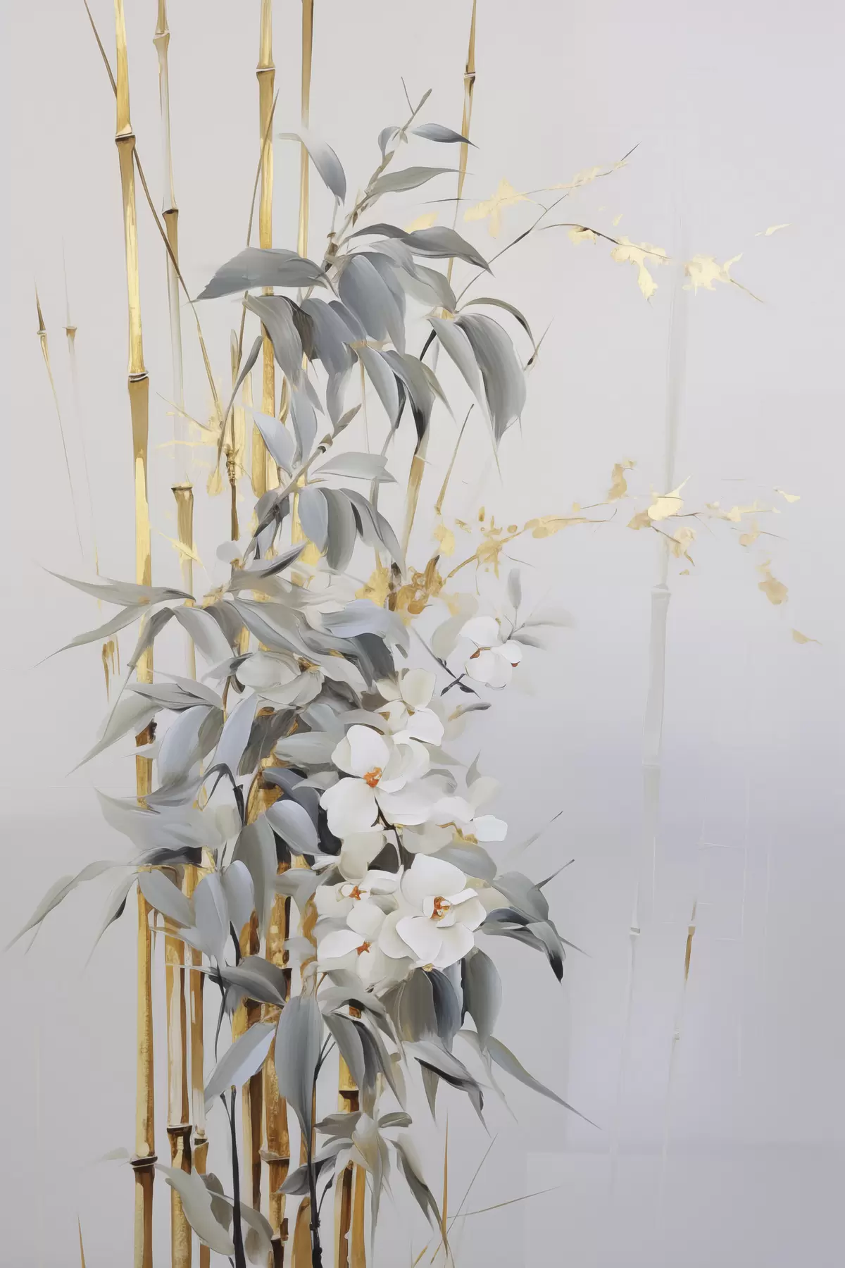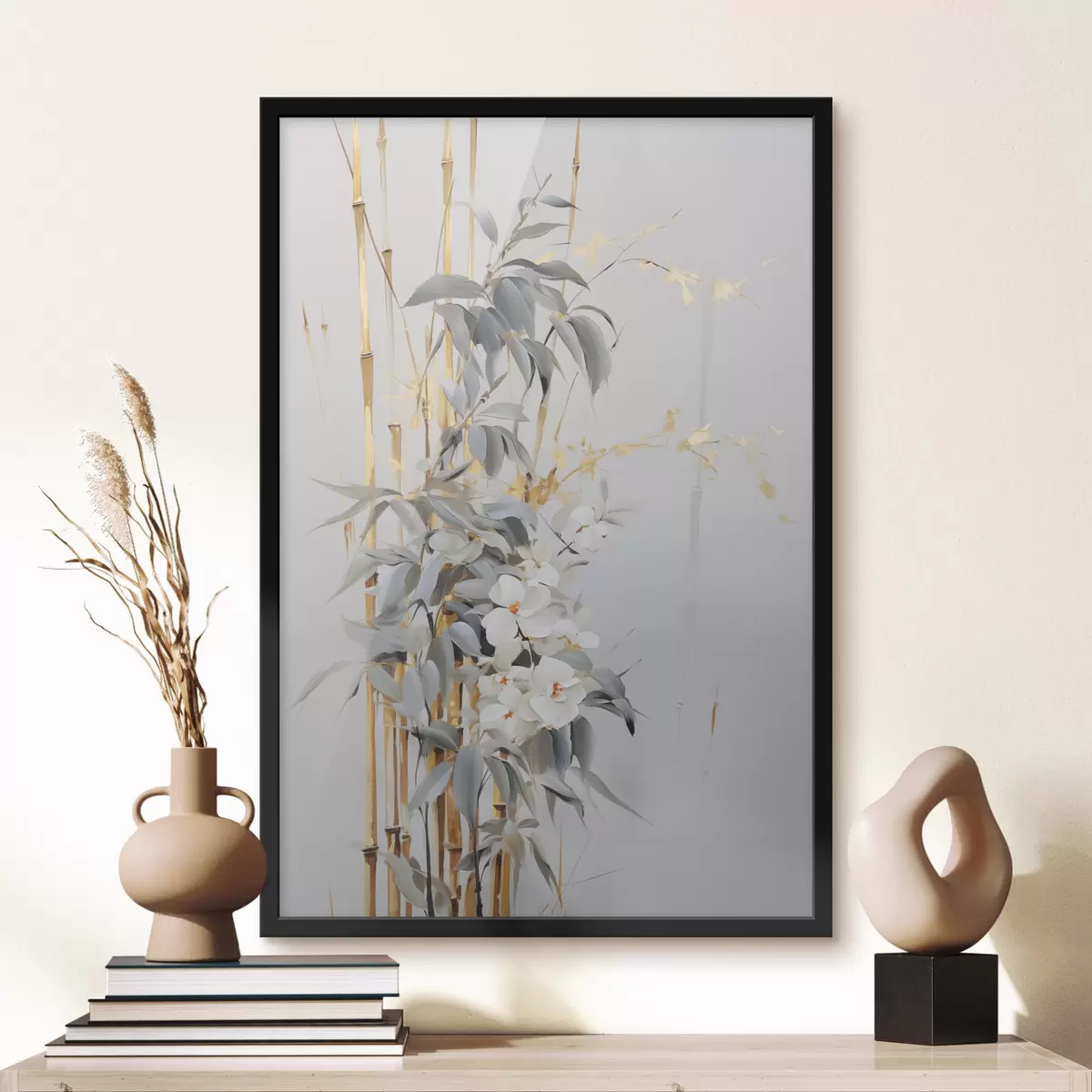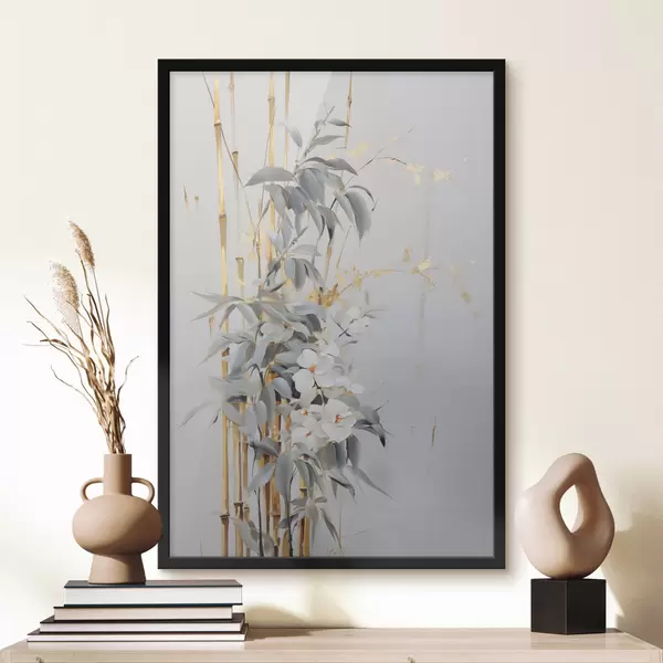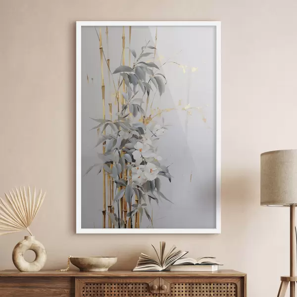 Постер на стіну Абстрактні бамбукові стебла з жовтими акцентами, ніжні білі квіти та блідо-зелене листя, сірий фон Nr f47038