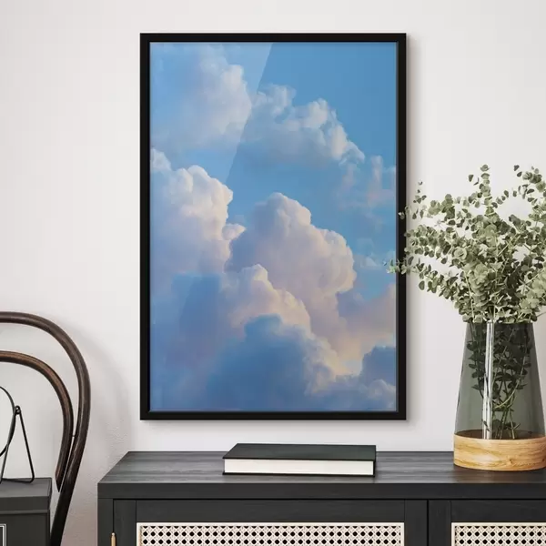 Постер на стіну Об'ємні хмари в м'якій блакитно-рожевій палітрі в стилі фотореалістичної цифрової графіки Nr f47088