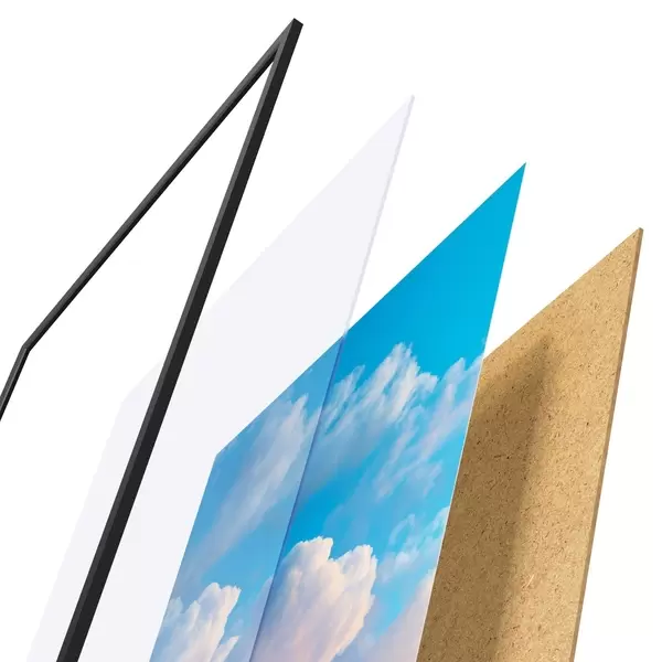 Постер складається з рами, оргскла, надрукованого зображення та підкладки з ДСП. Завдяки кріпленням на звороті плакат можна одразу ж повісити на стіну.