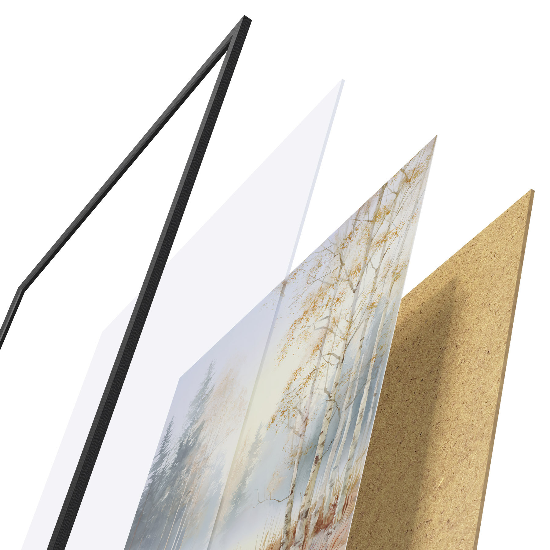 Постер складається з рами, оргскла, надрукованого зображення та підкладки з ДСП. Завдяки кріпленням на звороті плакат можна одразу ж повісити на стіну.