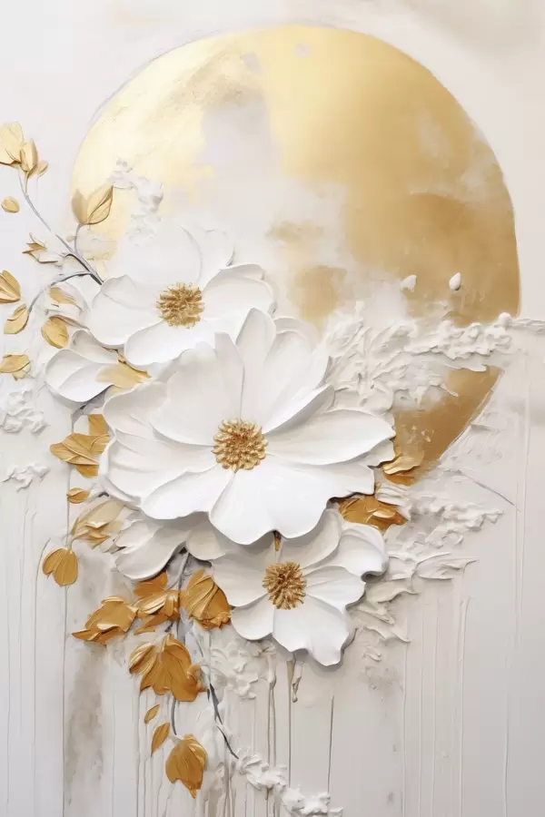 Постер на стіну Білі квіти з жовтими акцентами та ніжним листям на фактурному тлі, сучасне мистецтво Nr f47414