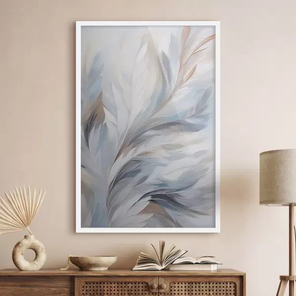 Постер на стіну Ніжні світло-блакитні та коричневі пір'їнки з м'якою, ефірною текстурою на білому тлі Nr f47416