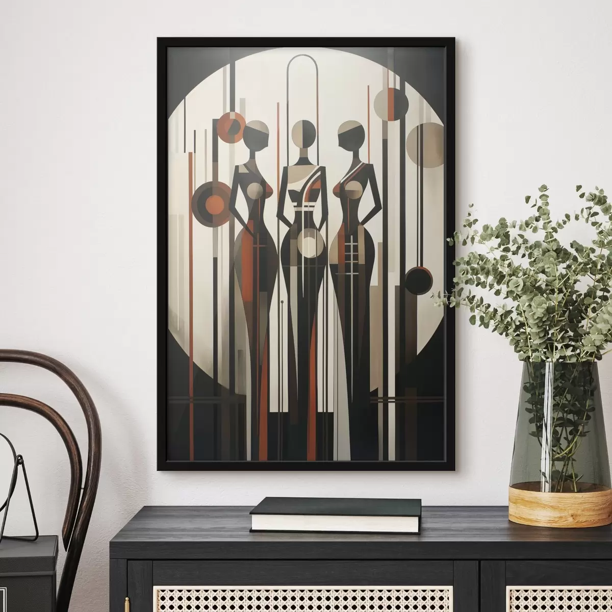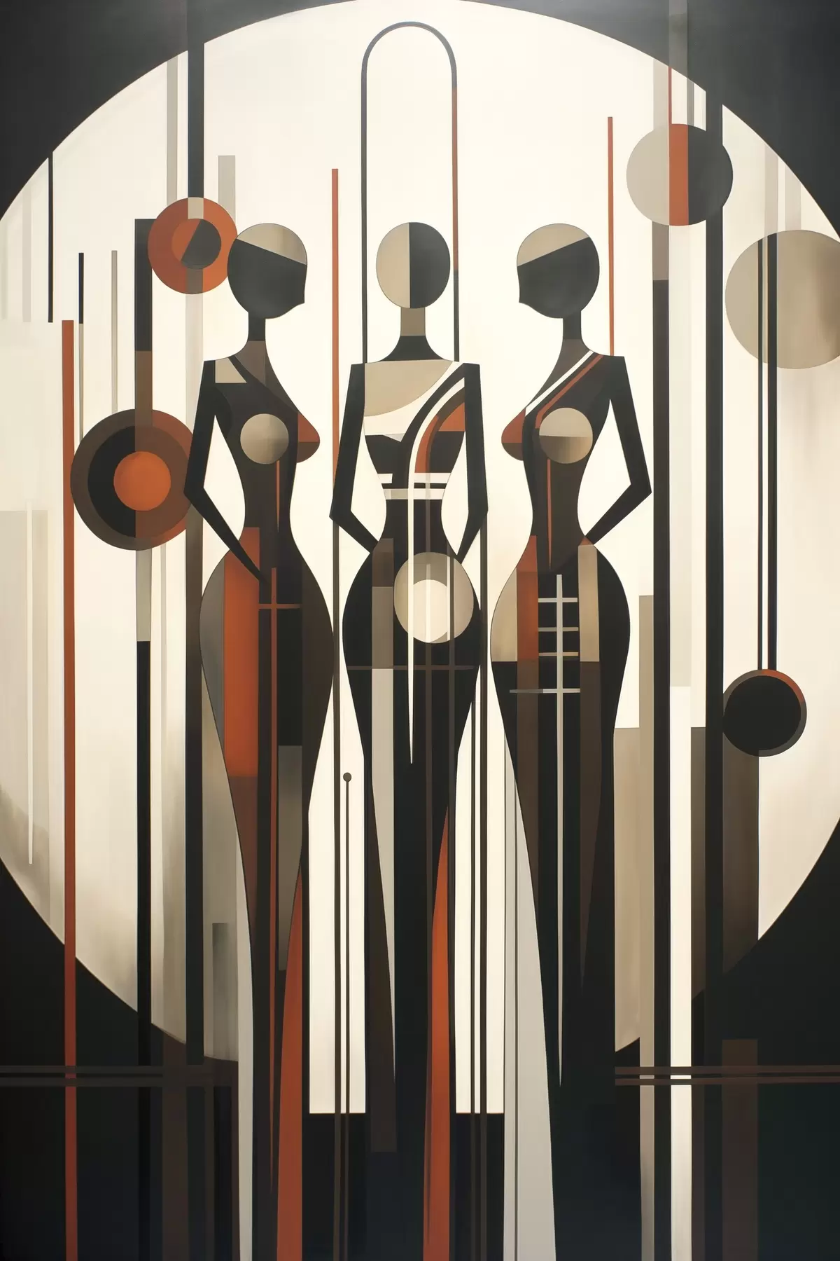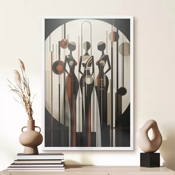 Постер на стіну Стилізовані жіночі фігури з геометричними елементами на абстрактному тлі з вертикальних ліній і кіл Nr f47422