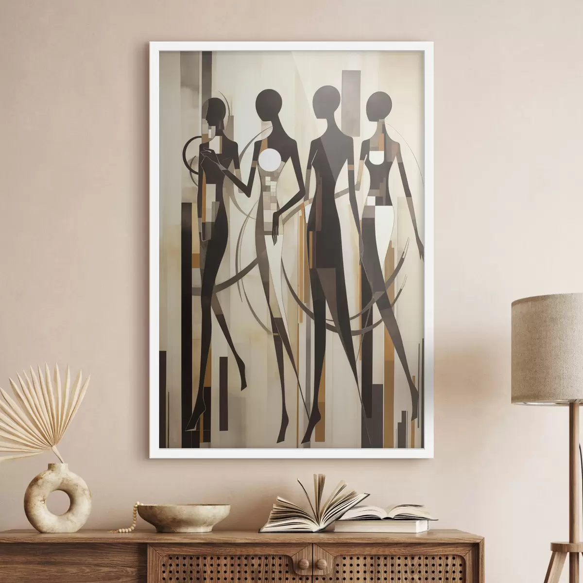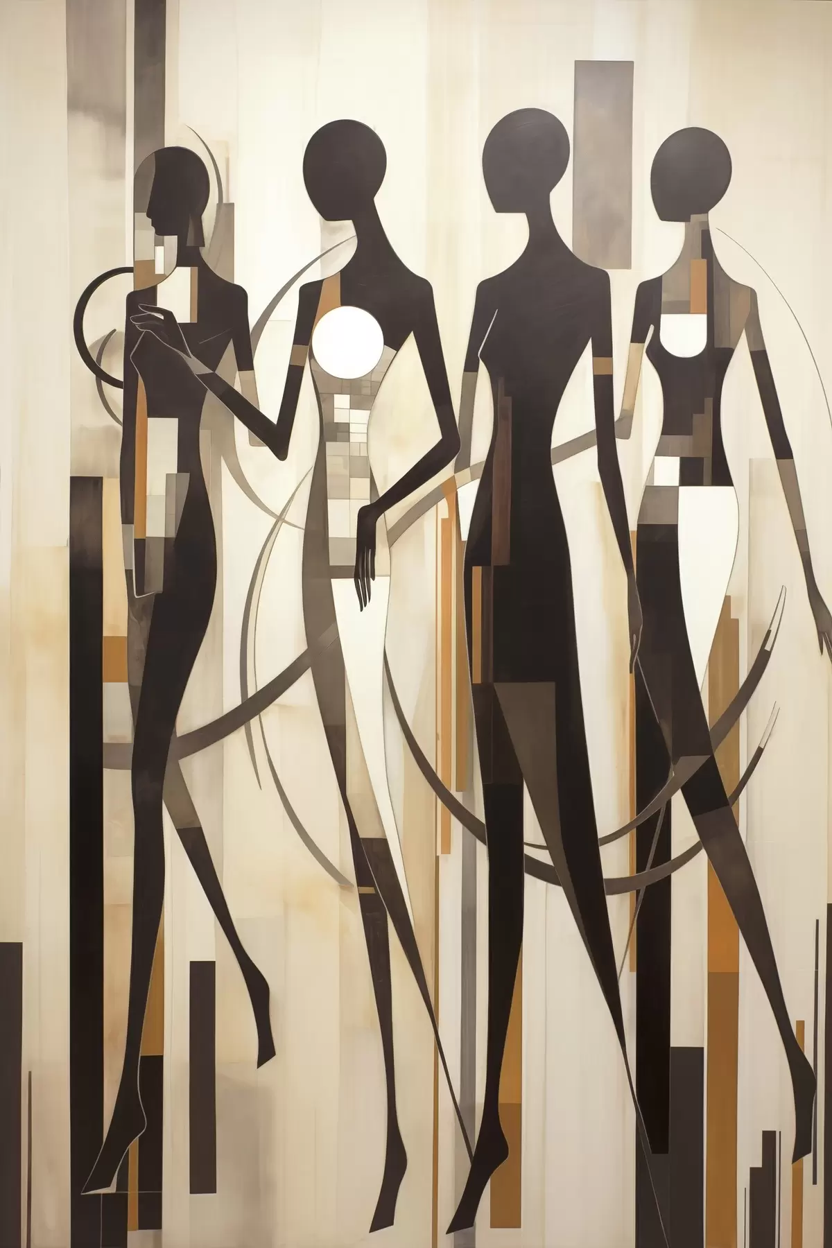 Постер на стіну Стилізовані жіночі фігури з геометричними елементами на абстрактному тлі вертикальних ліній Nr f47423