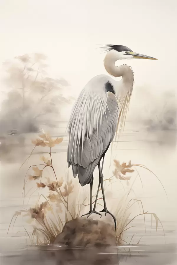 Постер на стіну Чапля стоїть на камені в озері, на тлі високої трави та дерев Nr f47426