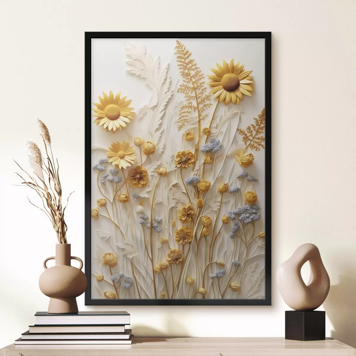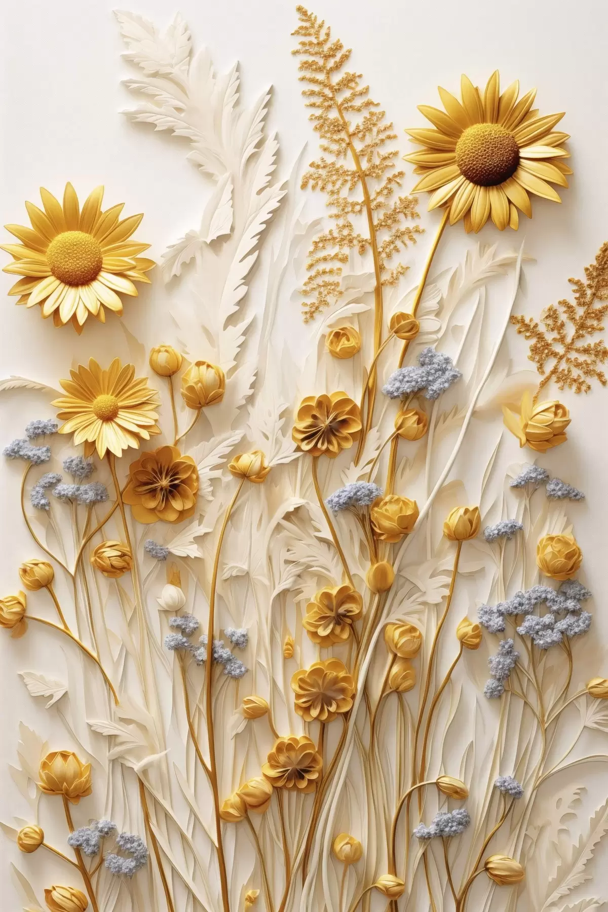 Постер на стіну Текстурована колекція жовтих і білих маргариток із сухими травами та гілочками лаванди на білому тлі Nr f47431