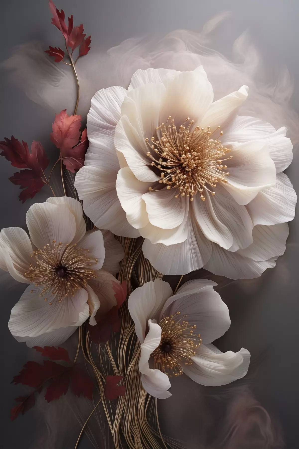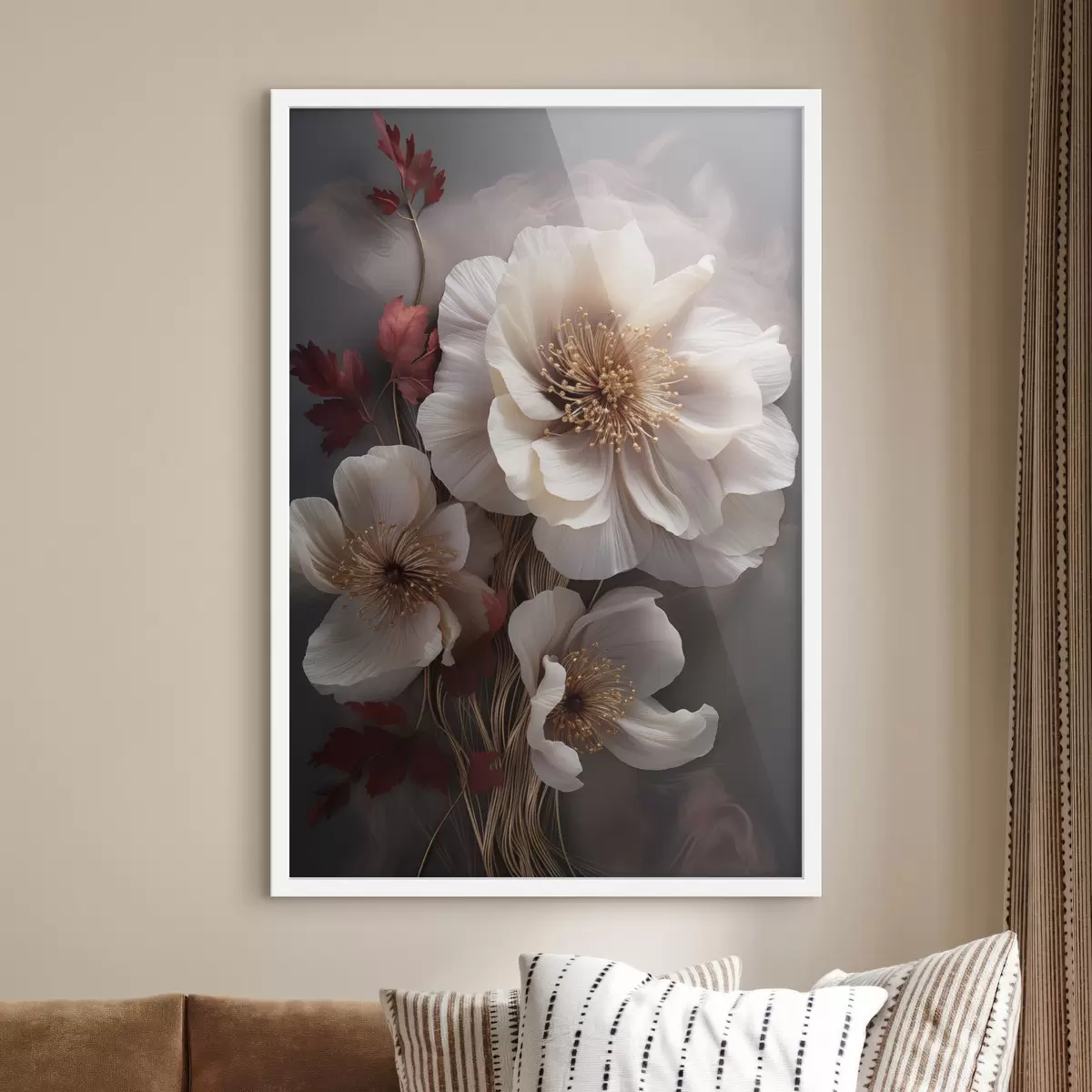 Постер на стіну Ніжні півонії з тонкими, легкими пелюстками, оточені темно-червоним листям на абстрактному тлі Nr f47434