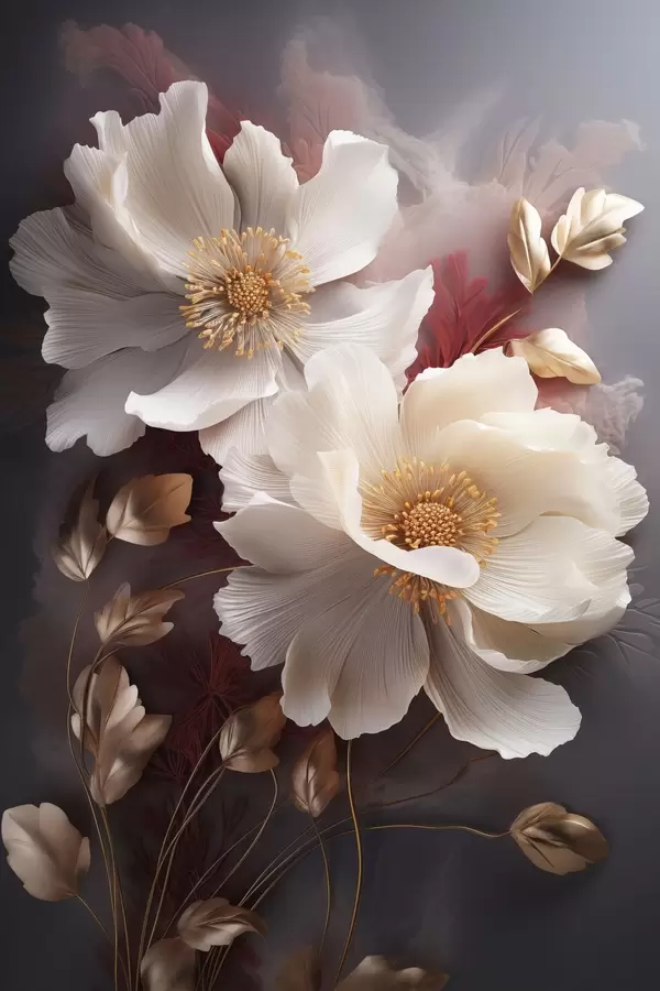 Постер на стіну Ніжні півонії з тонкими, легкими пелюстками, оточені темно-червоним і жовтим листям на абстрактному тлі Nr f47435
