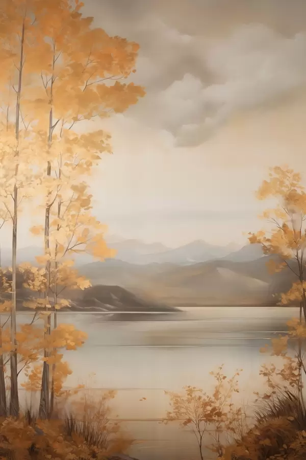 Постер на стіну Осінні дерева з помаранчевим листям обрамляють спокійне озеро з далекими горами під хмарним небом. Nr f47441