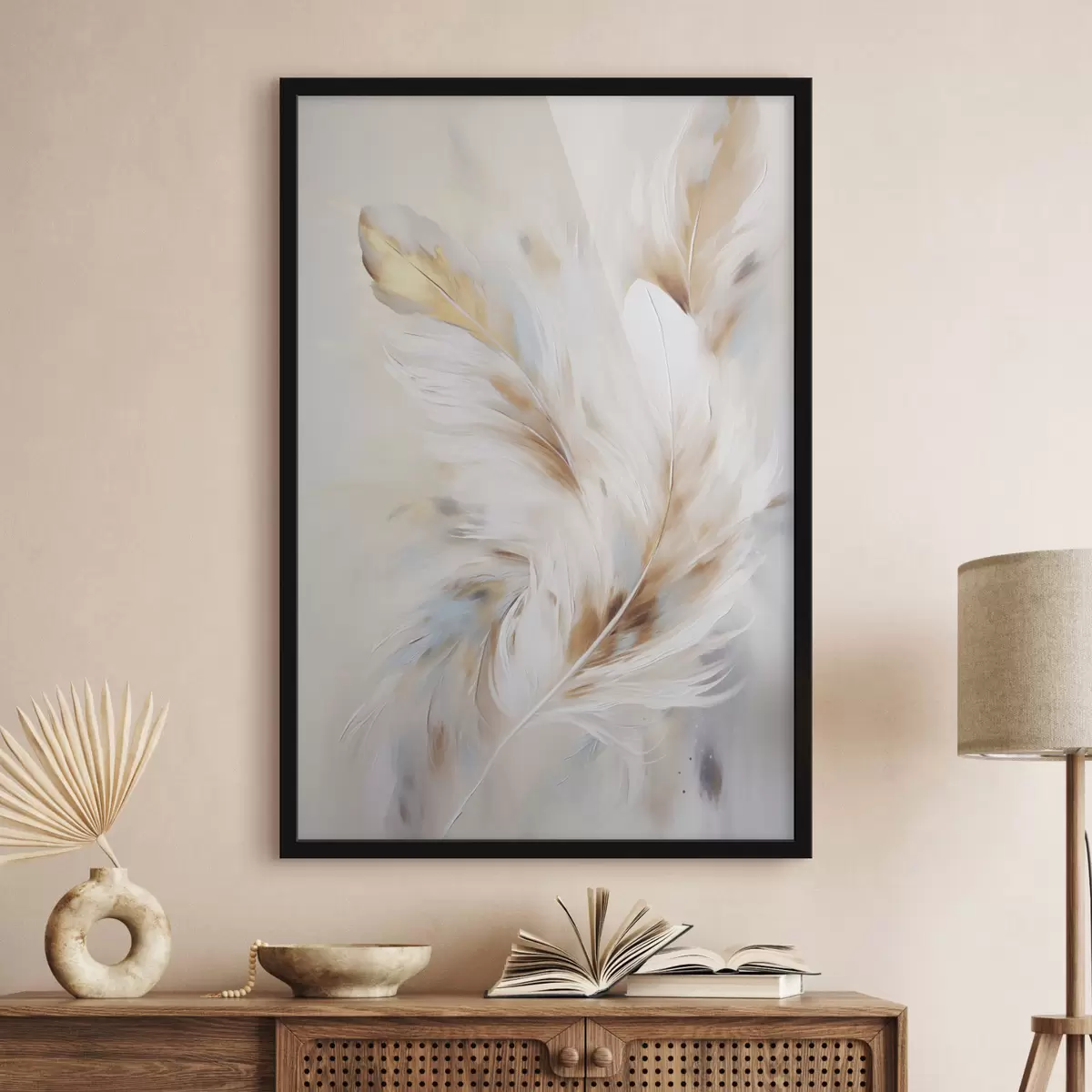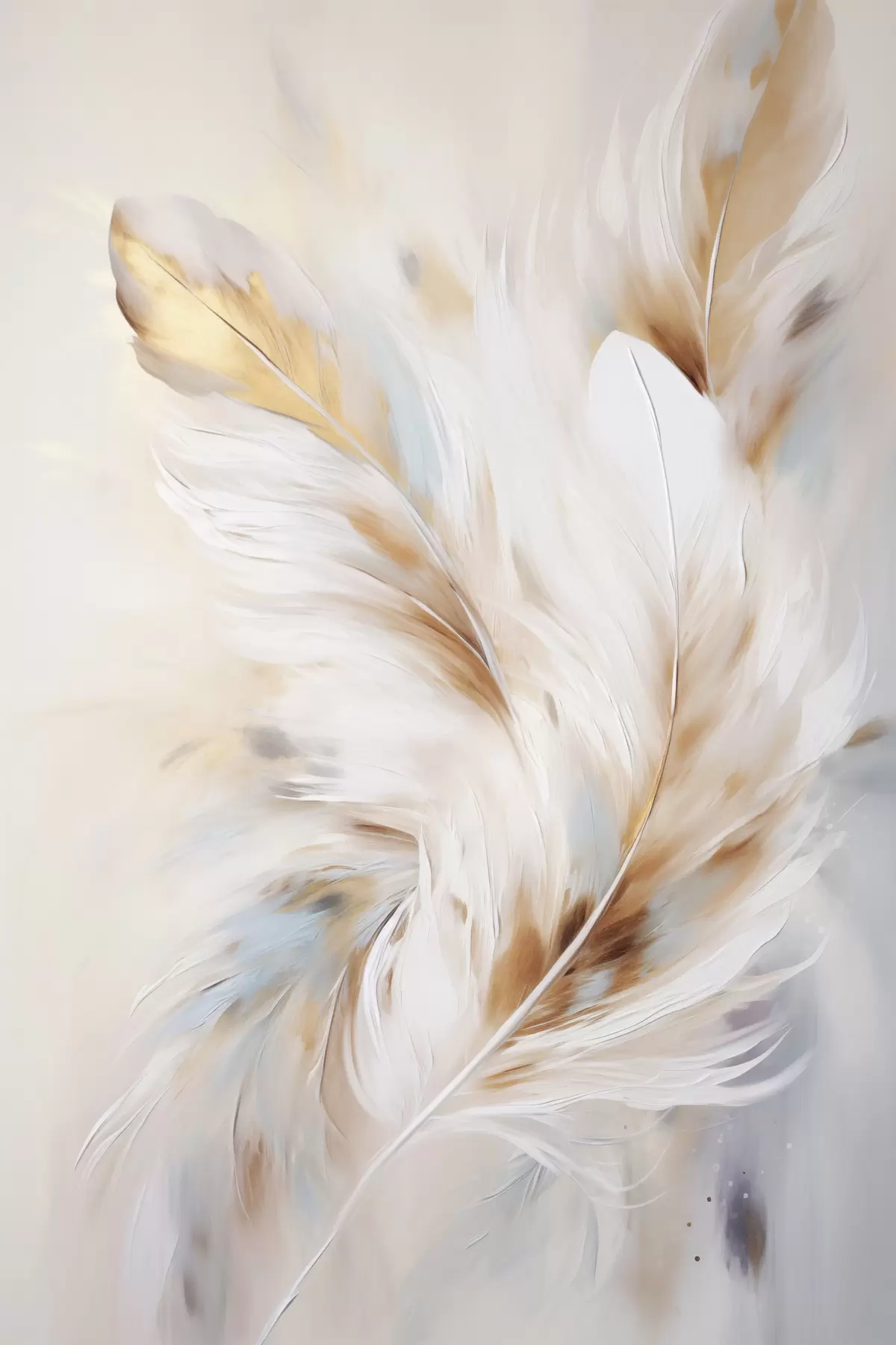 Постер на стіну Великі м'які пір'я з поєднанням білих, жовтих і коричневих відтінків на світлому абстрактному тлі Nr f47442