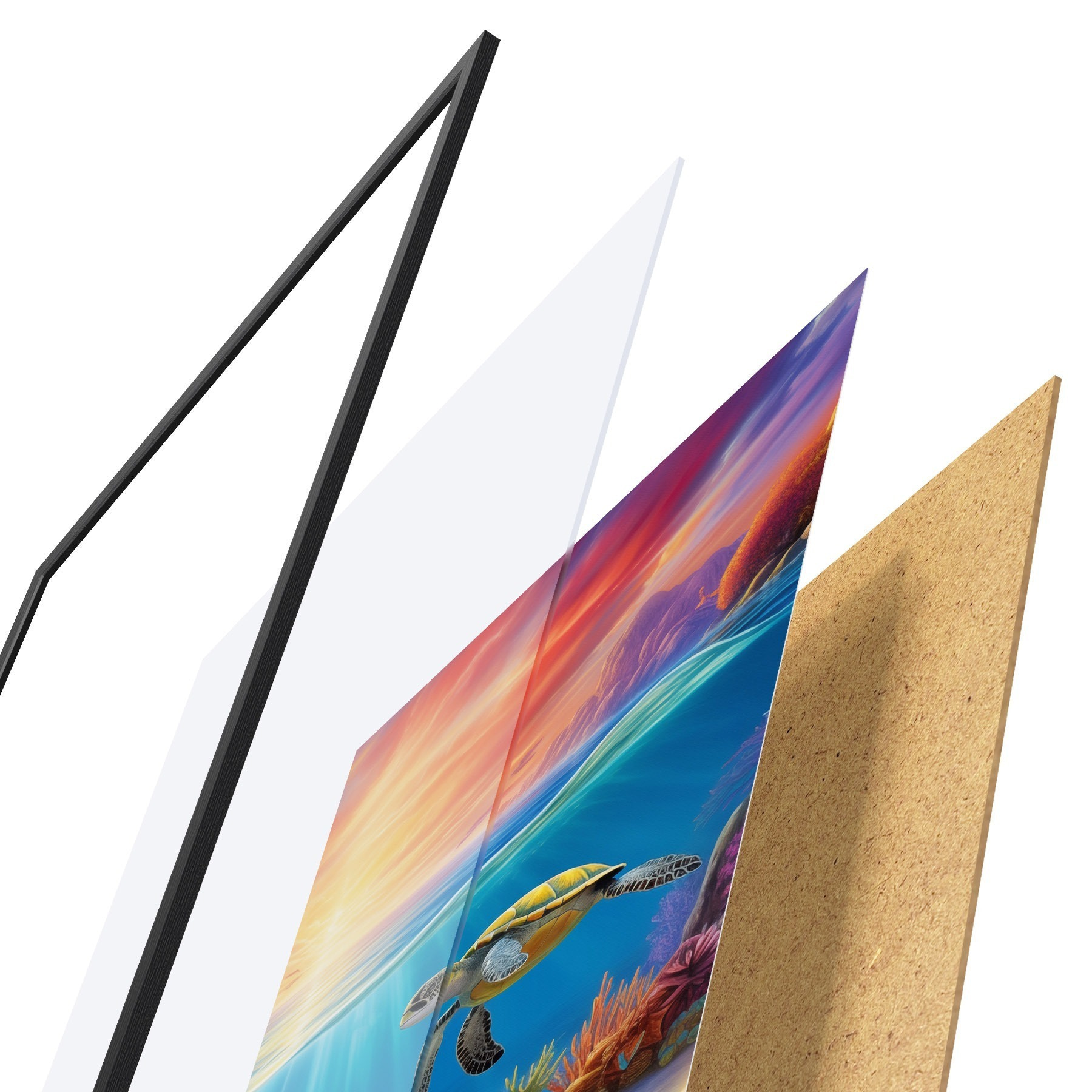 Постер складається з рами, оргскла, надрукованого зображення та підкладки з ДСП. Завдяки кріпленням на звороті плакат можна одразу ж повісити на стіну.