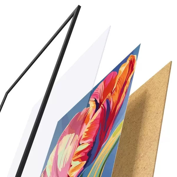 Постер складається з рами, оргскла, надрукованого зображення та підкладки з ДСП. Завдяки кріпленням на звороті плакат можна одразу ж повісити на стіну.