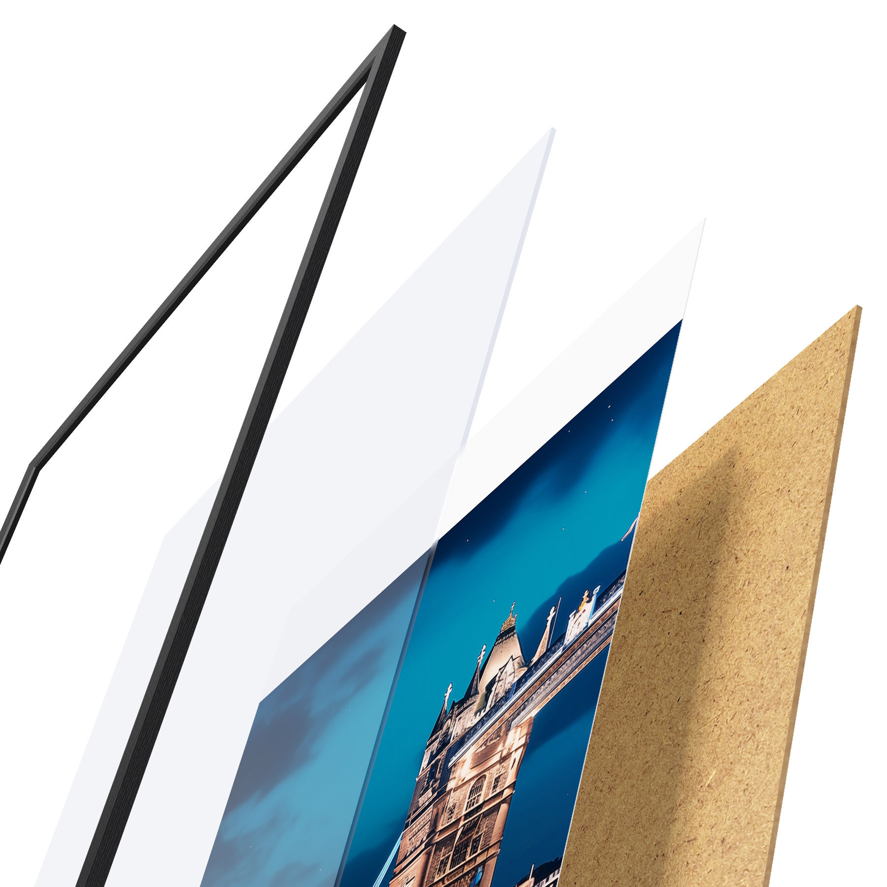 Постер складається з рами, оргскла, надрукованого зображення та підкладки з ДСП. Завдяки кріпленням на звороті плакат можна одразу ж повісити на стіну.