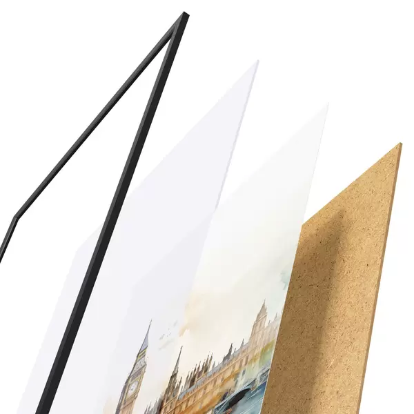 Постер складається з рами, оргскла, надрукованого зображення та підкладки з ДСП. Завдяки кріпленням на звороті плакат можна одразу ж повісити на стіну.